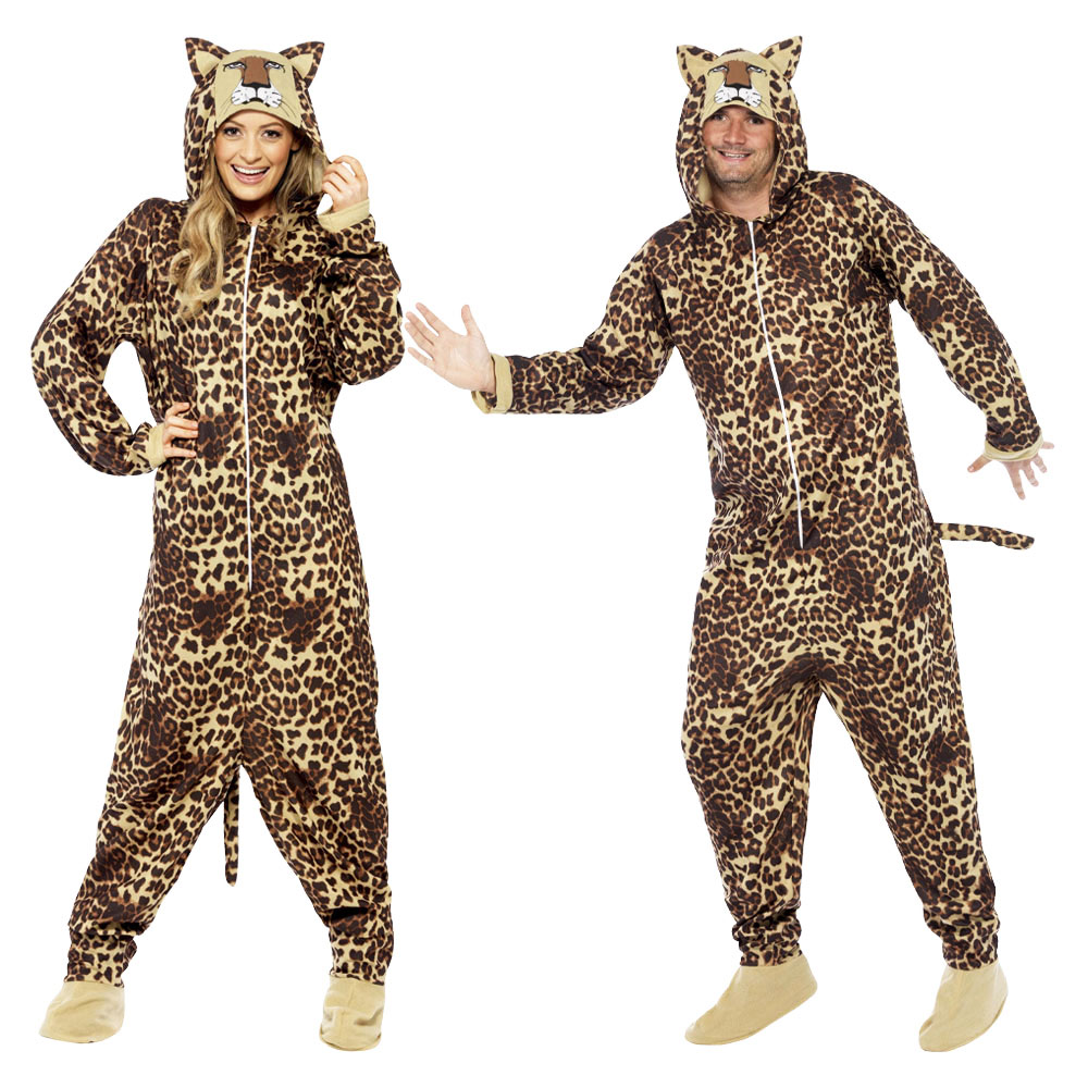 Leoparddräkt omfattar en leopardmönstrad helkroppsdräkt av polyester med utstickande svans och huva med motiv av ett leopardansikte. Passar vuxna.