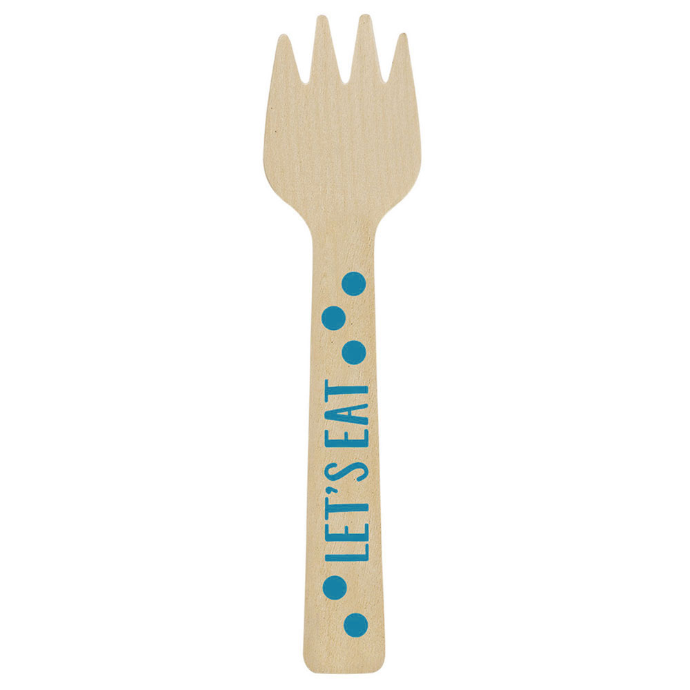 Små trägafflar med söta prickar och texten "Let's Eat" i blått blir utan tvivel ett snyggt tillbehör till många olika sorters kalas- och fest-dukningar. Med dessa minigafflar blir det enkelt att få till en snygg servering av desserter, små tilltugg, plockmat och liknande.