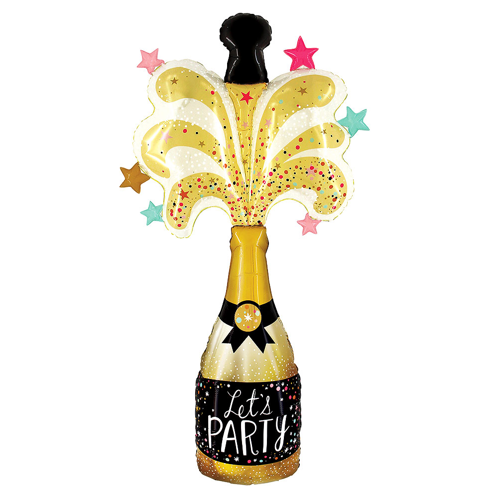 Lets Party Champagneflaska Stor Folieballong omfattar en tvådelad folieballong i form av en champagneflaska som sprutar skum med text "Let's Party". Ballongen blir över 150 cm stor när den fylls och kan fyllas med både luft och helium.