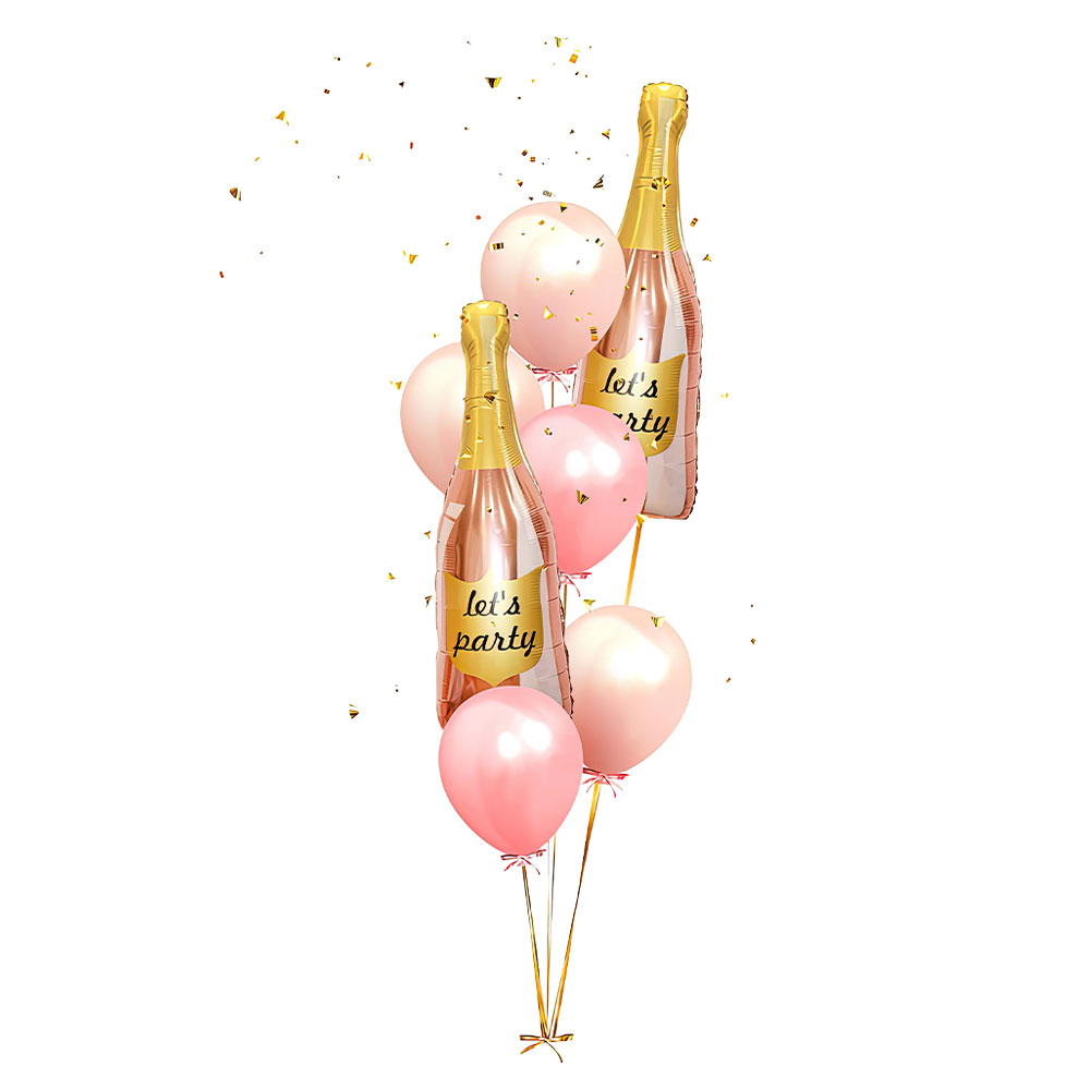 Let's Party Folieballong Champagneflaska omfattar en självförslutande folieballong i form av en champagneflaska i guld och roséguld med texten "Let's Party". Ballongen fylls med luft eller helium och är ca 91 cm hög samt 40 cm bred. Medföljer även ett litet rör för enkel uppblåsning.