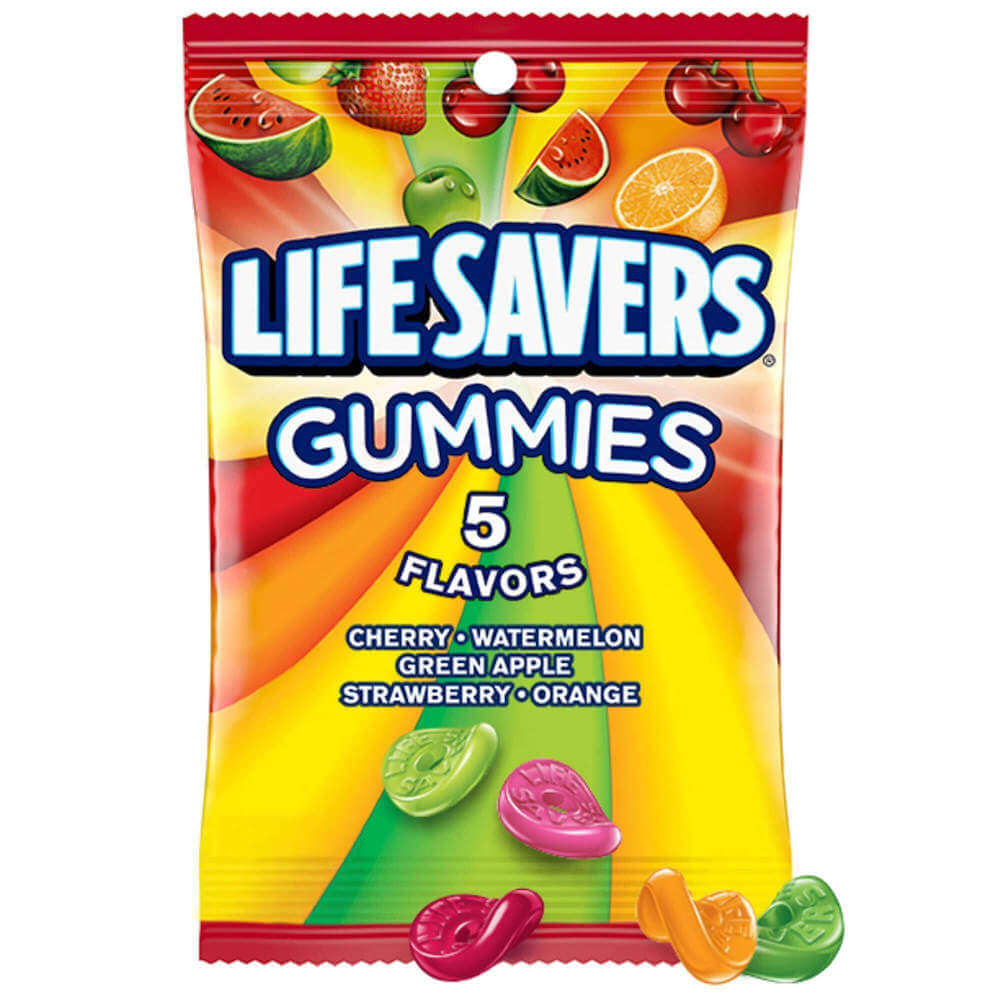 Life Savers Gummies 5 Flavor. Naturligt och artificiellt smaksatt. Körsbär, vattenmelon, grönt äpple, björnbär och jordgubbe. Life Savers Gummies 5 Flavor kombinerar den äkta smaken du förväntar dig från Life Savers med det roliga i en gummigodis.