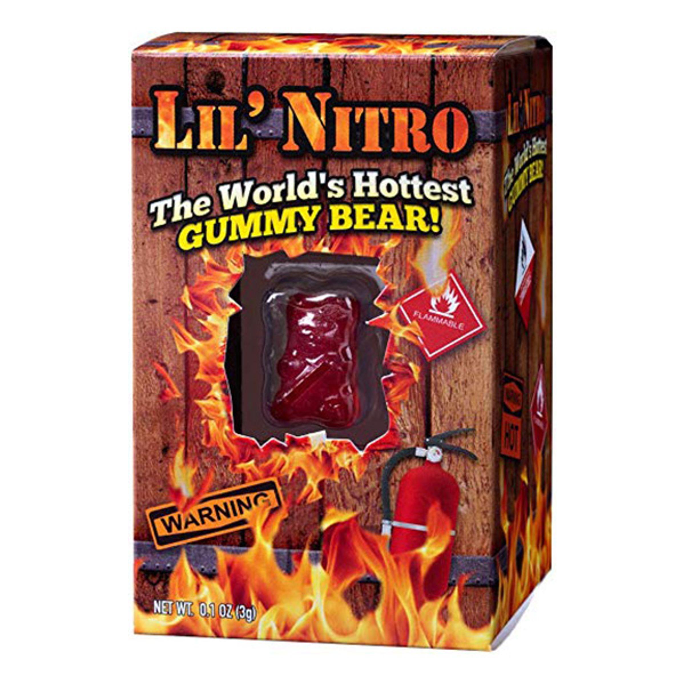 Lil' Nitro Gummibjörn är en liten och gulli… STARK JÄKLA BJÖRN som får även den tuffaste att börja storgrina! Björnen levereras styckvis i en snygg ask, perfekt att ge bort i födelsedagspresent till exempelvis farsan eller kompisen. Gummibjörnen både luktar och ser ut som en helt vanlig gummibjörn, men innehåller ett chiliextrakt på hela NIO MILJONER SCOVILLE vilket gör denna gummibjörn cirka 900 gånger starkare än en vanlig jalapeño.