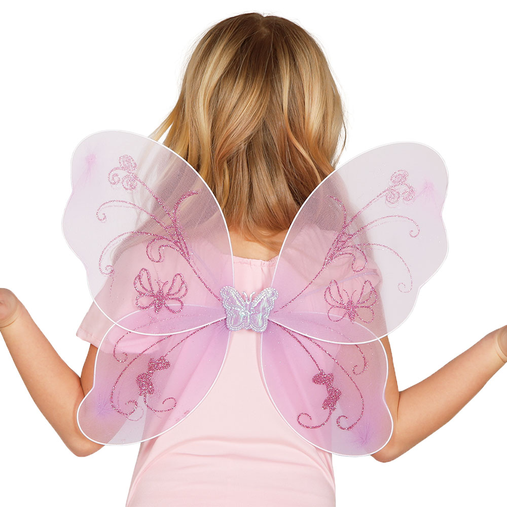 Lila Fjärilsvingar Barn omfattar ett par lila fjärilsvingar med glittriga detaljer för barn. Vingarna är ca 35 cm höga samt 48 cm breda och hålls på plats med hjälp av elastiska band som träs runt armarna.