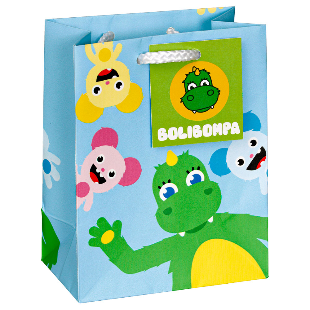 Liten Bolibompa Presentpåse omfattar en liten presentpåse av papp i ljusblått med motiv av Bolibompa draken och tre små björnar. Påsen mäter 14 x 11 cm och har vita handtag med en liten etikett att skriva på.