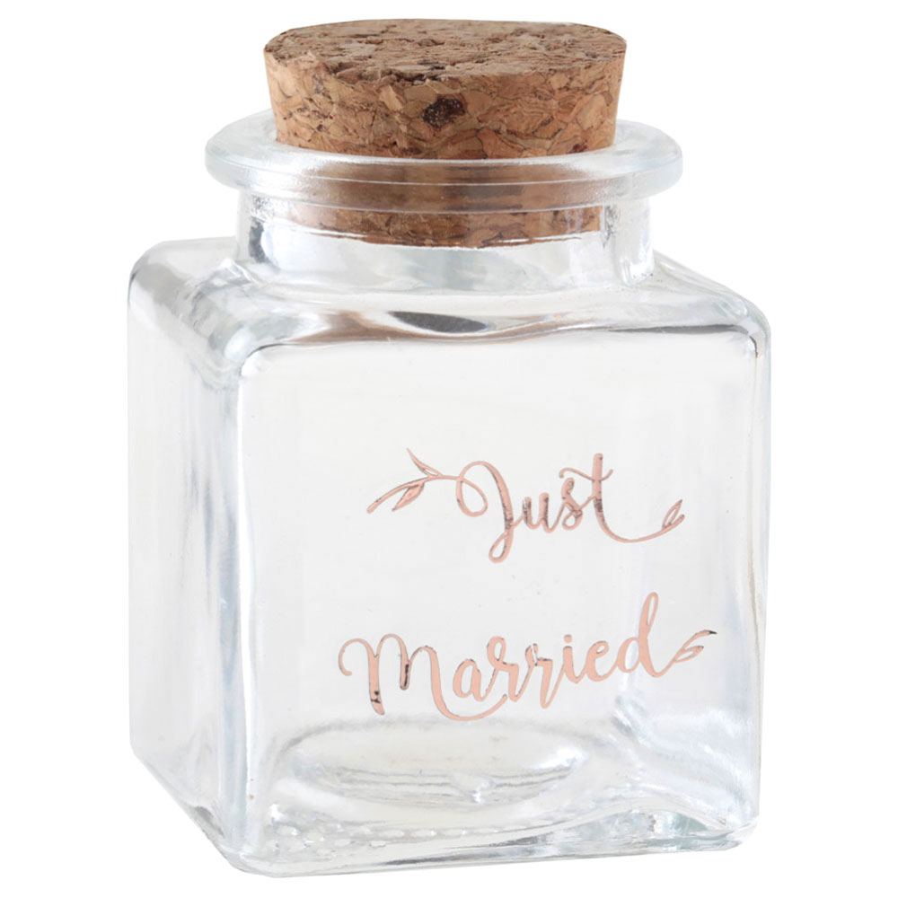 Skapa en fin bordsdekoration till kommande bröllop med denna tjusiga lilla glasflaska! Elegant liten flaska med kork och texten "Just Married" i roseguld som utan tvekan gör den till en perfekt bröllopsdekoration. Använd den som den är eller fyll den med valfritt innehåll. Ett toppenbra val för dig som söker en fin dekoration-flaska att piffa upp bröllopsbordet med.