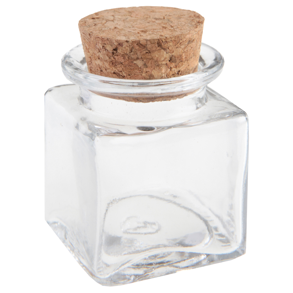 Liten Glasflaska omfattar en liten, fyrkantig dekorationsflaska med kork. Flaskan är tillverkad av glas och är ca 5 cm hög, 4 cm bred samt 4 cm djup.