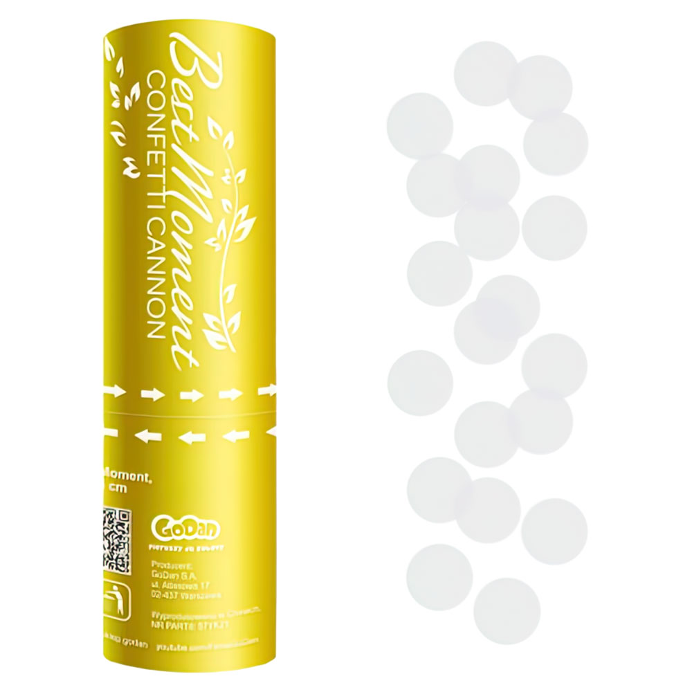 Liten Konfettikanon Vit omfattar en 15 cm stor konfettikanon i guld med vit konfetti inuti. Konfettikanonen kan användas både inomhus och utomhus. Instruktioner finns på förpackningen.