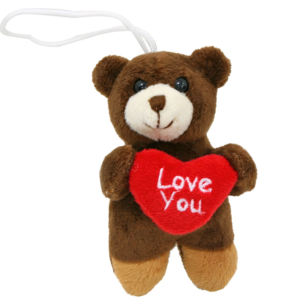 Liten Nalle med Hjärta Brun omfattar en liten brun gosedjursnalle i polyester hållandes ett rött hjärta med texten "Love you". Gosedjuret är ca 9 cm hög och har en liten ögla på huvudet.