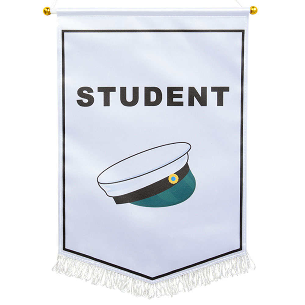 Saluterande studentmössor och flaggor vajar i takt med framtidshopp där vimpeln firar nyutexaminerade studenter. Denna dekoration lyser upp varje student-fest och studentmottagning, symboliserande början på en ny era. Den perfekta studentflaggan för att hedra minnesvärda ögonblick.