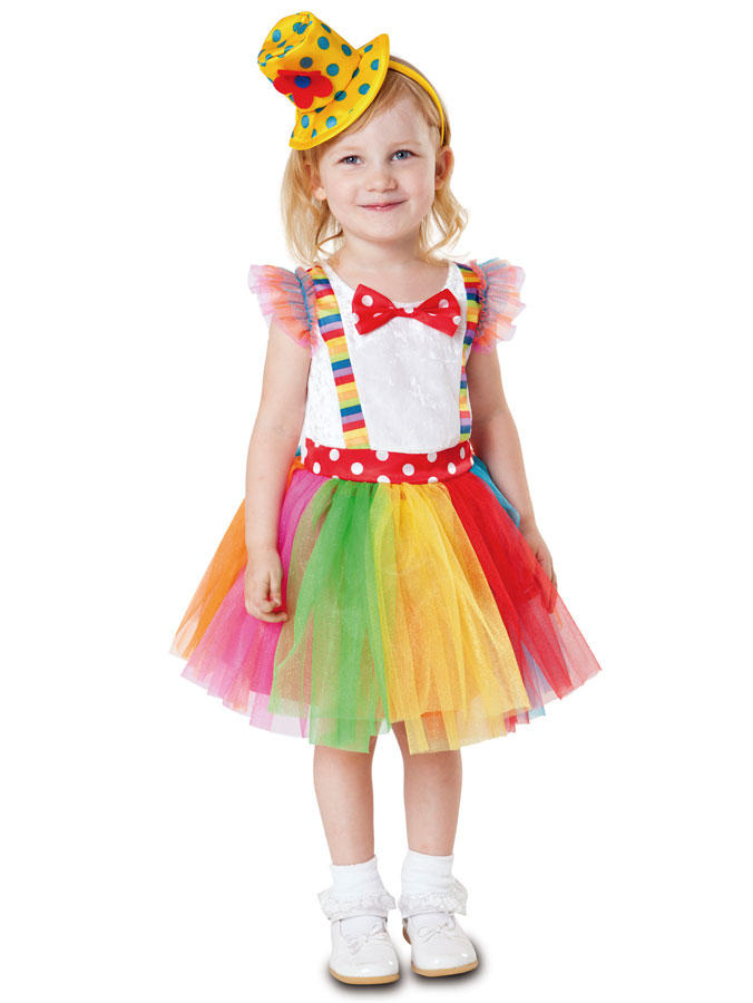 Little Clown Maskeraddräkt Barn består av en söt klänning med vit överdel med randiga hängslen, prickig fluga, fluffiga tyll-ärmar och färgglad, fluffig tyllkjol. Ingår även ett diadem med en gul liten hatt som är dekorerad med blåa prickar och en orange blomma.