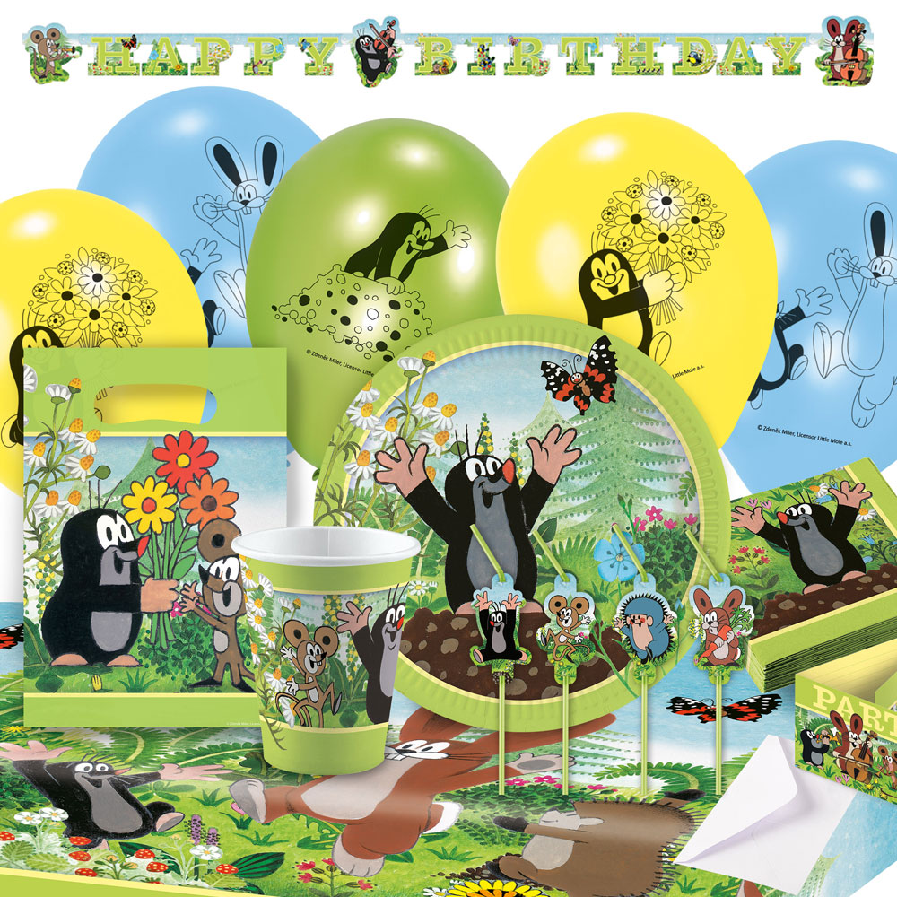 Little Mole Kalaspaket omfattar ett kit med kalas tillbehör samt dekorationer med motiv av serie-karaktären Little Mole.