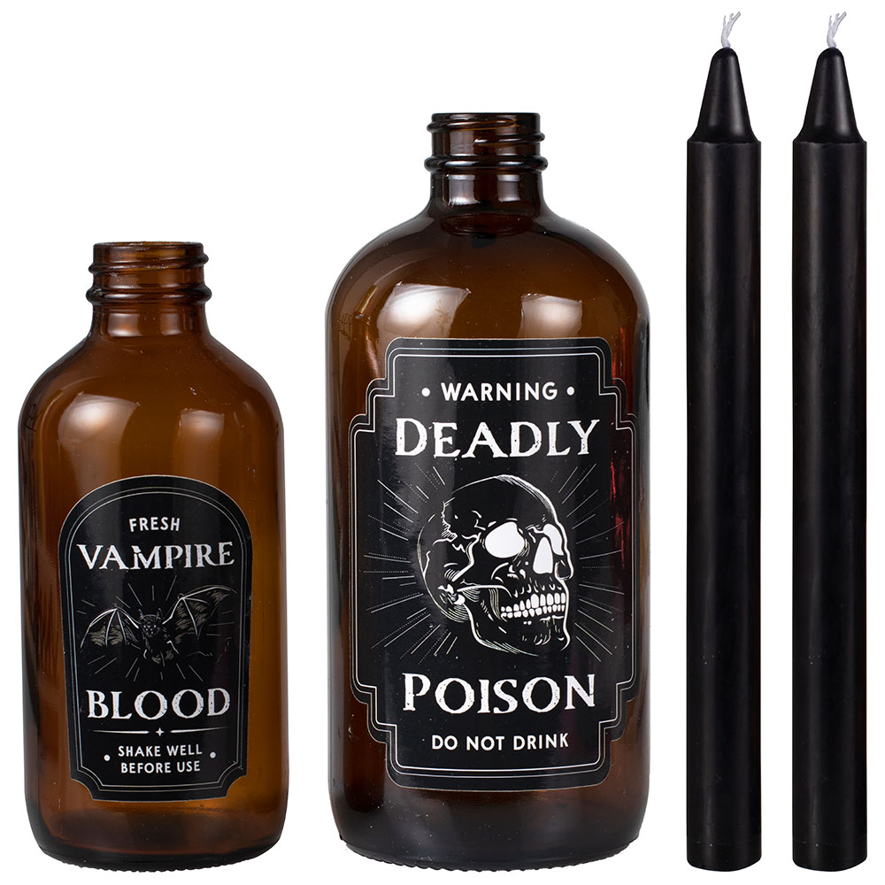 Ljushållare med Stearinljus Halloween består av två stycken ljusstakar i brunt glas samt två svarta avsmalnande stearinljus. Ljushållarna är designade som cylinderformade flaskor och bär etiketter för olika "trolldrycker". Etiketterna är svarta med vit text. Den större flaskans etikett har texten: "WARNING DEADLY POISON DO NOT DRINK" samt en bild på en dödskalle. Den mindre flaskan har texten: "FRESH VAMPIRE BLOOD SHAKE WELL…
