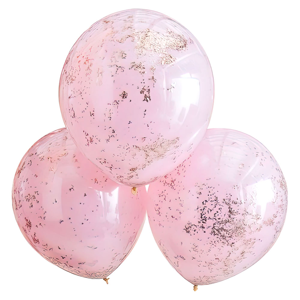 Ljusrosa Konfettiballonger Dubbla Lager omfattar 3 stycken ljusrosa latexballonger med dubbla lager och guldig konfetti inuti. Ballongerna fylls med luft eller helium och blir ca 45 cm stora.