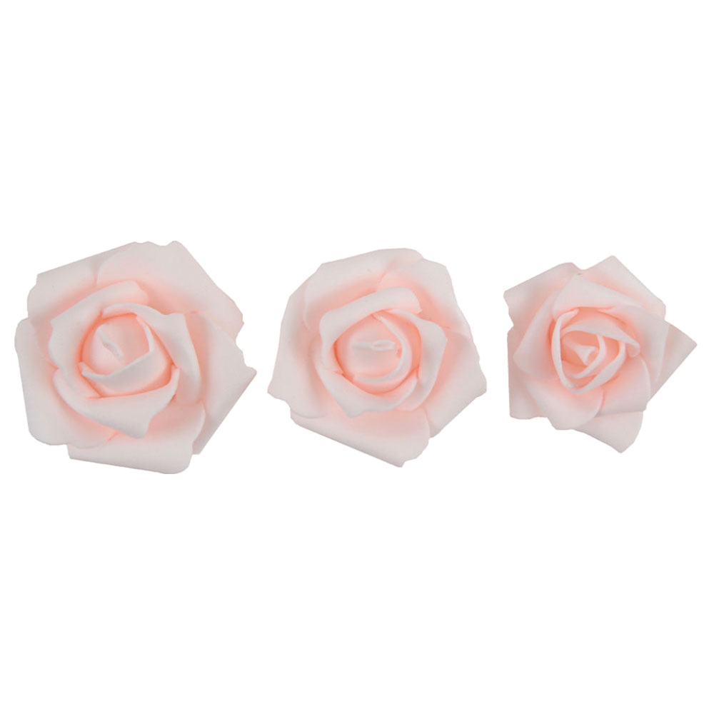 Ljusrosa Konstrosor omfattar 9 stycken ljusrosa konstrosor av skummaterial. Rosorna kommer i tre olika storlekar och mäter ca 5, 5,5 och 7 cm i diameter.