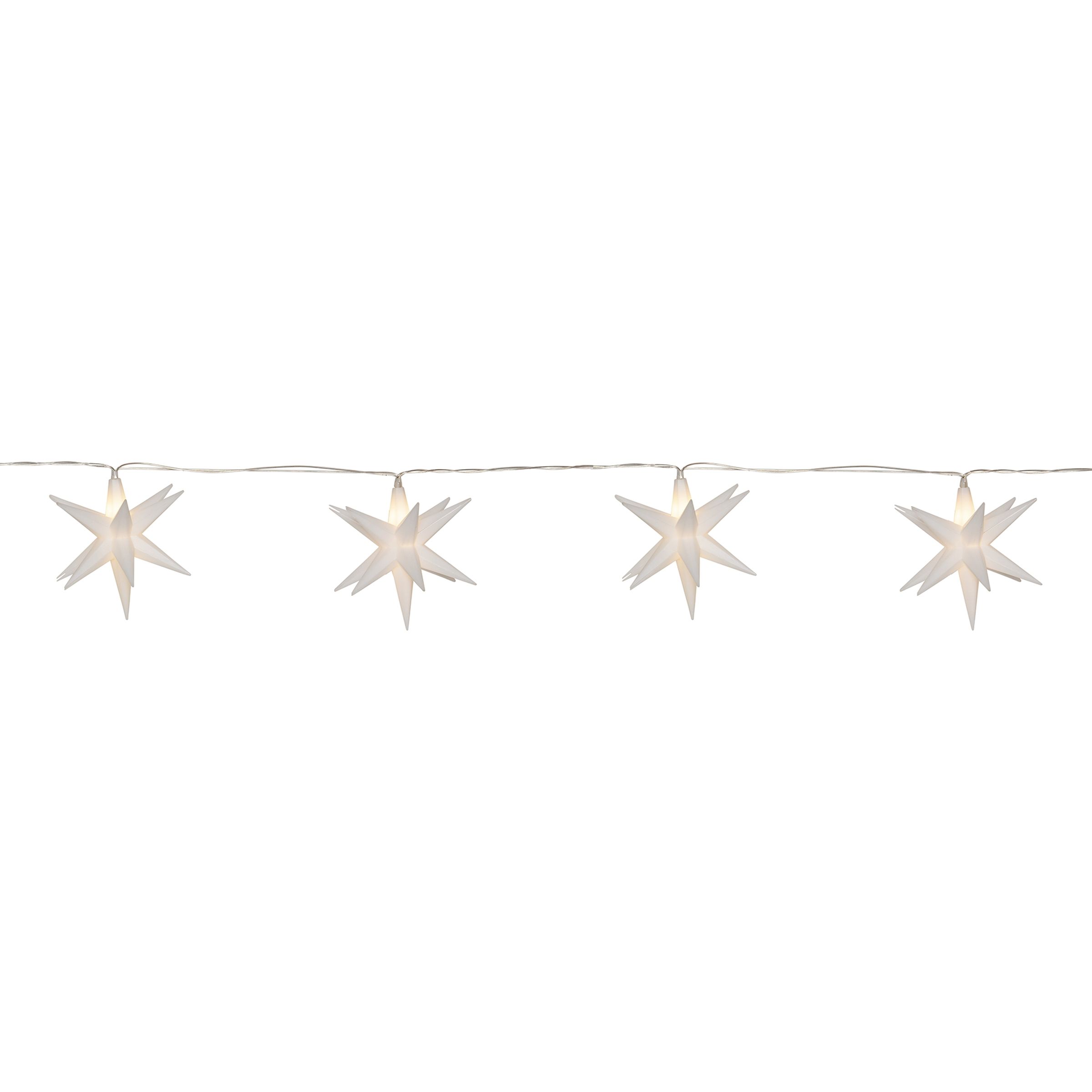 Ljusslinga Julstjärnor Vit är en ljusslinga med varmvitt sken och 8 st vita stjärnor för inomhusbruk, varje stjärna har 12 uddar. Batteridriven med timerfunktion. En klassisk juldekoration som förhöjer stämningen i hemmet.