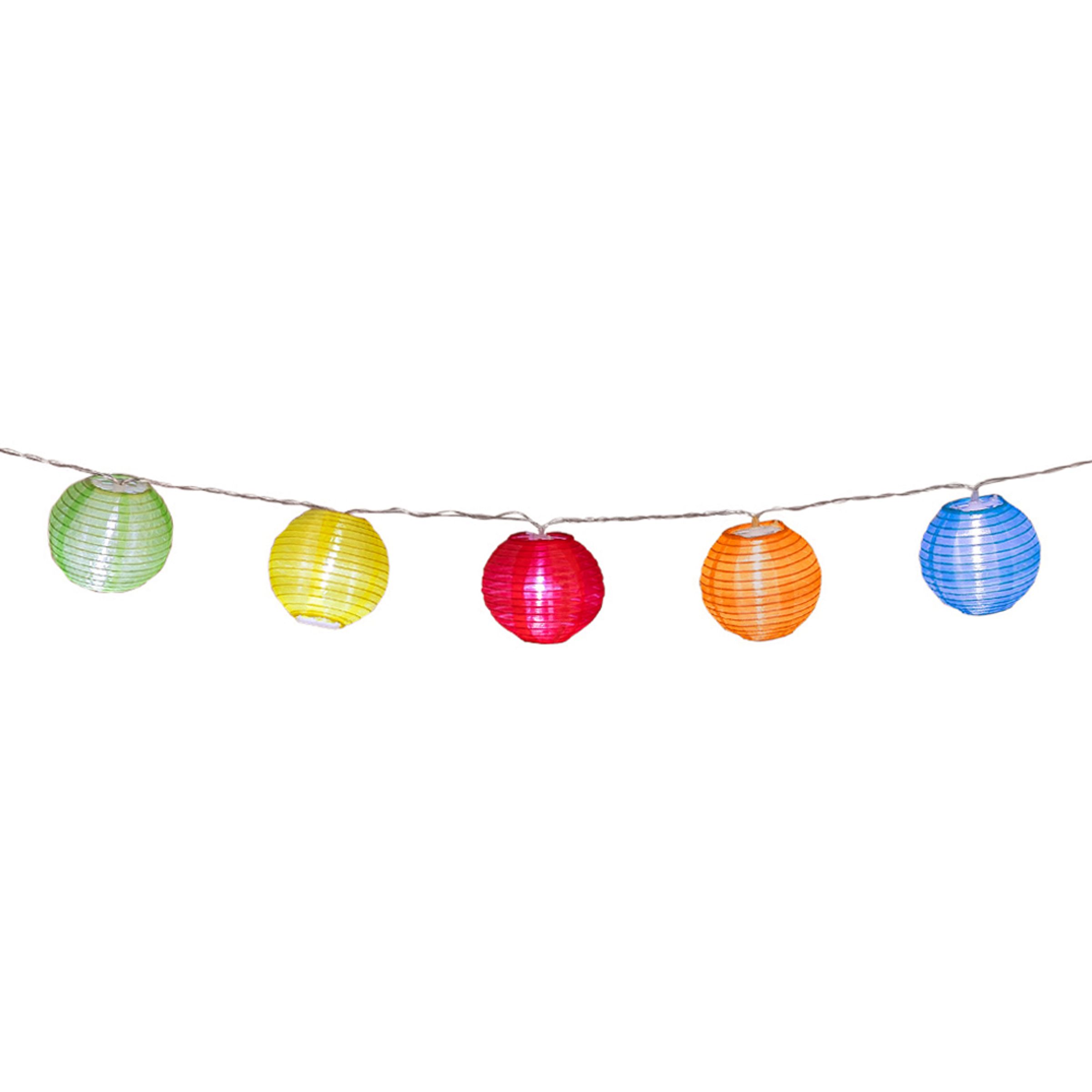 Ljusslinga Lyktor Flerfärgade är en härlig ljusslunga med tio stycken färgglada lyktor som påminner om rislampor. LED-slingan drivs med batterier och passar därför lika bra att använda i taket som på väggen eller på bordet.