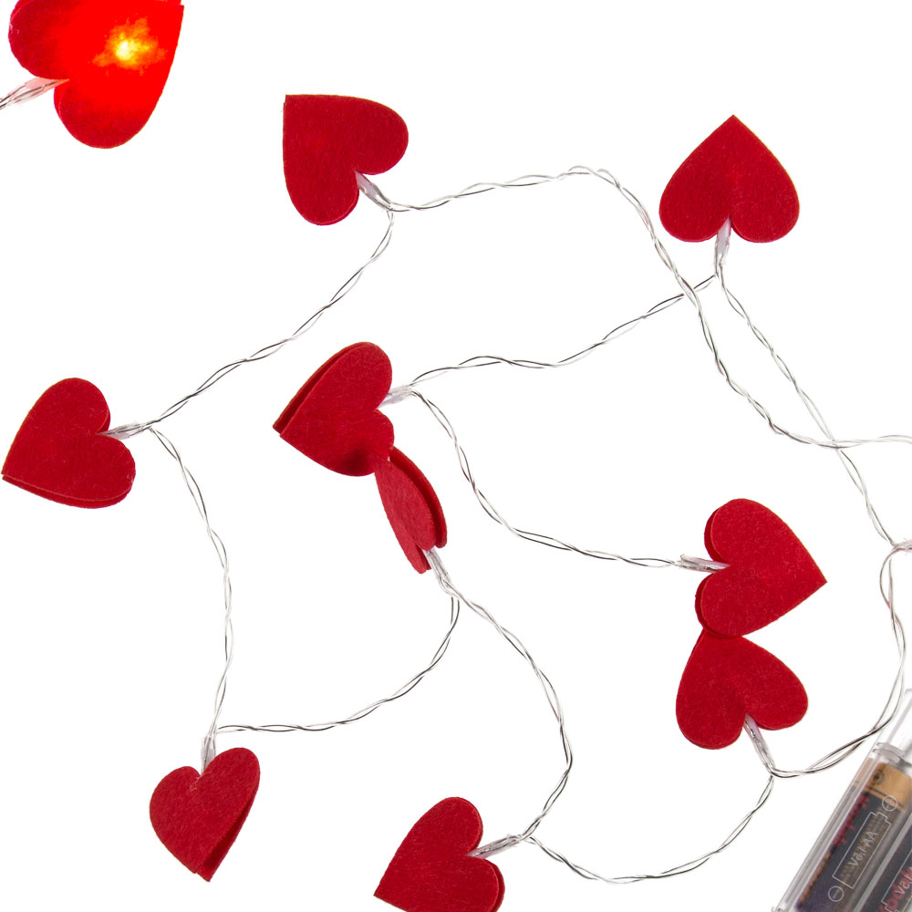 Ljusslinga Röd Hjärtan omfattar en ca 120 cm lång ljusslinga med röda tyghjärtan. Ljusslingan drivs av 2 st AA-battrier och är avsedd för inomhusbruk.