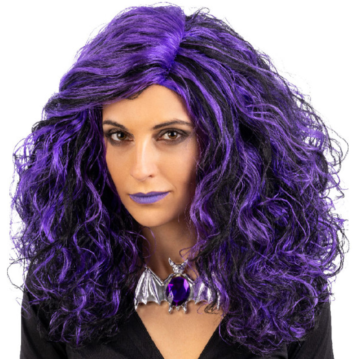 Lockig Häxperuk Svart och Lila omfattar en lång och vågig peruk med mittbena i färgerna svart och lila.