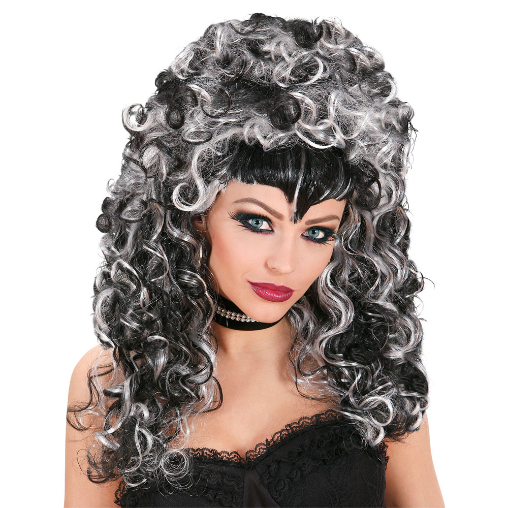 Lockig Peruk Evilicious omfattar en svart och vit, riktigt lockig peruk med lugg. Peruken är i polyester och passar vuxna.