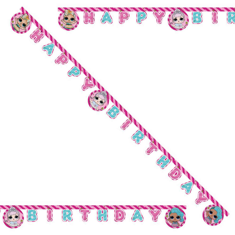 Lol Glitter Happy Birthday Girlang består av en lila och rosa girlang med bilder på Lol Surprise dockorna, samt texten "Happy Birthday". Bokstäverna och bilderna sitter fast på ett vitt snöre. Tillverkad i papp.