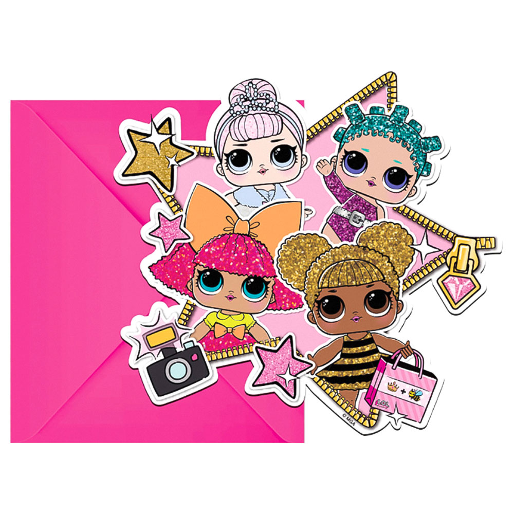 Lol Glitter Inbjudningskort omfattar sex stycken stjärnformade inbjudningskort med Lol Surprise motiv i olika färger. Korten har vit baksida med rosa streckade linjer och symboler för datum, tid, plats och telefon att själv fylla i. Rosa kuvert ingår.