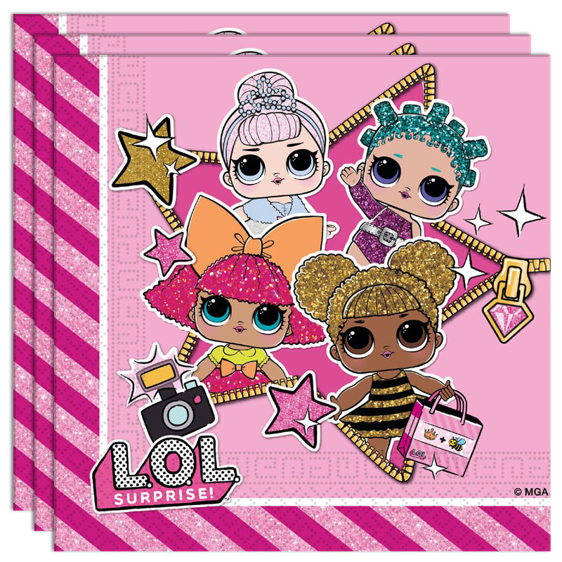Lol Glitter Servetter består av rosa servetter med häftigt motiv av Lol Surprise dockorna. Servetterna har 2 lager och är tillverkade i papper.