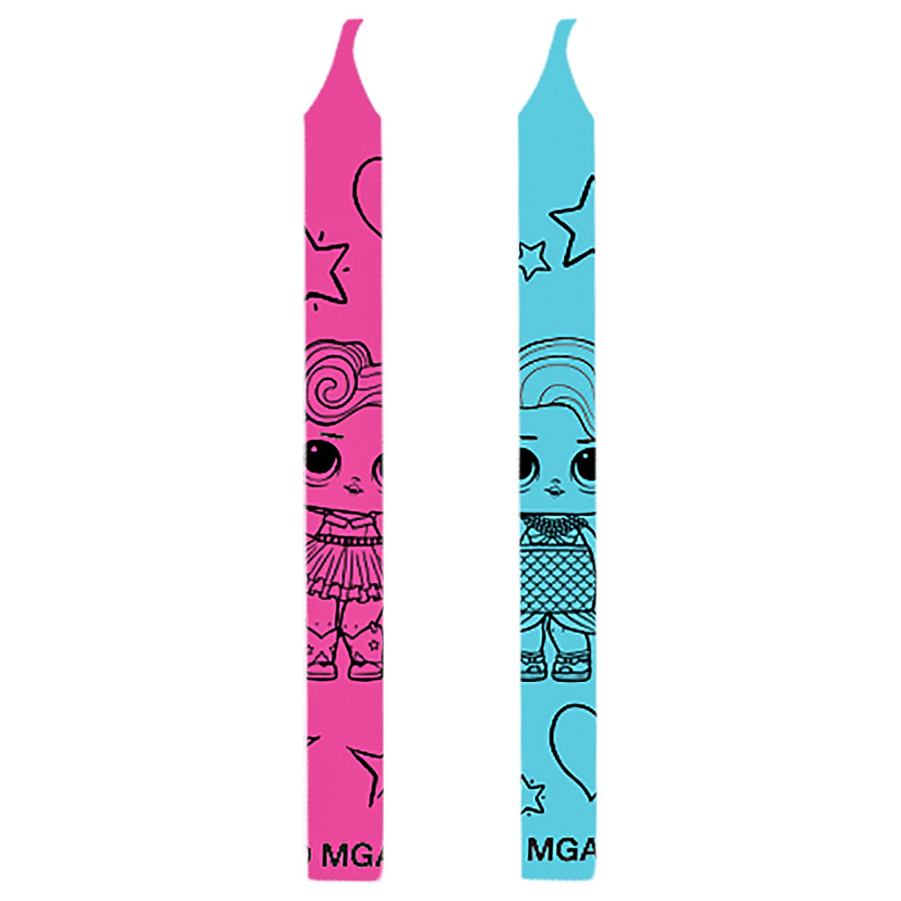 Lol Glitter Tårtljus Lila och Blå omfattar 12 stycken tårtljus i lila och blått med svarta konturmotiv av Lol Surprise. Ljusen är ca 8 cm höga och kommer med 12 stycken vita ljushållare i plast.