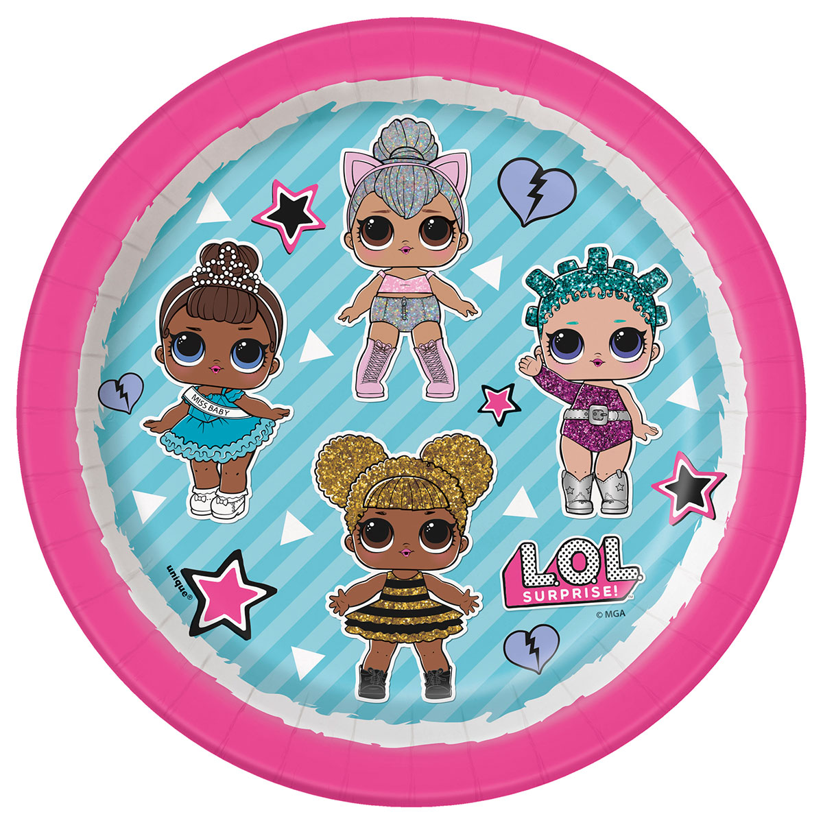Lol Surprise Assietter innehåller randiga engångsassietter i rosa och mörkrosa med ljusblåa detaljer och motiv av Lol Surprise dockor.