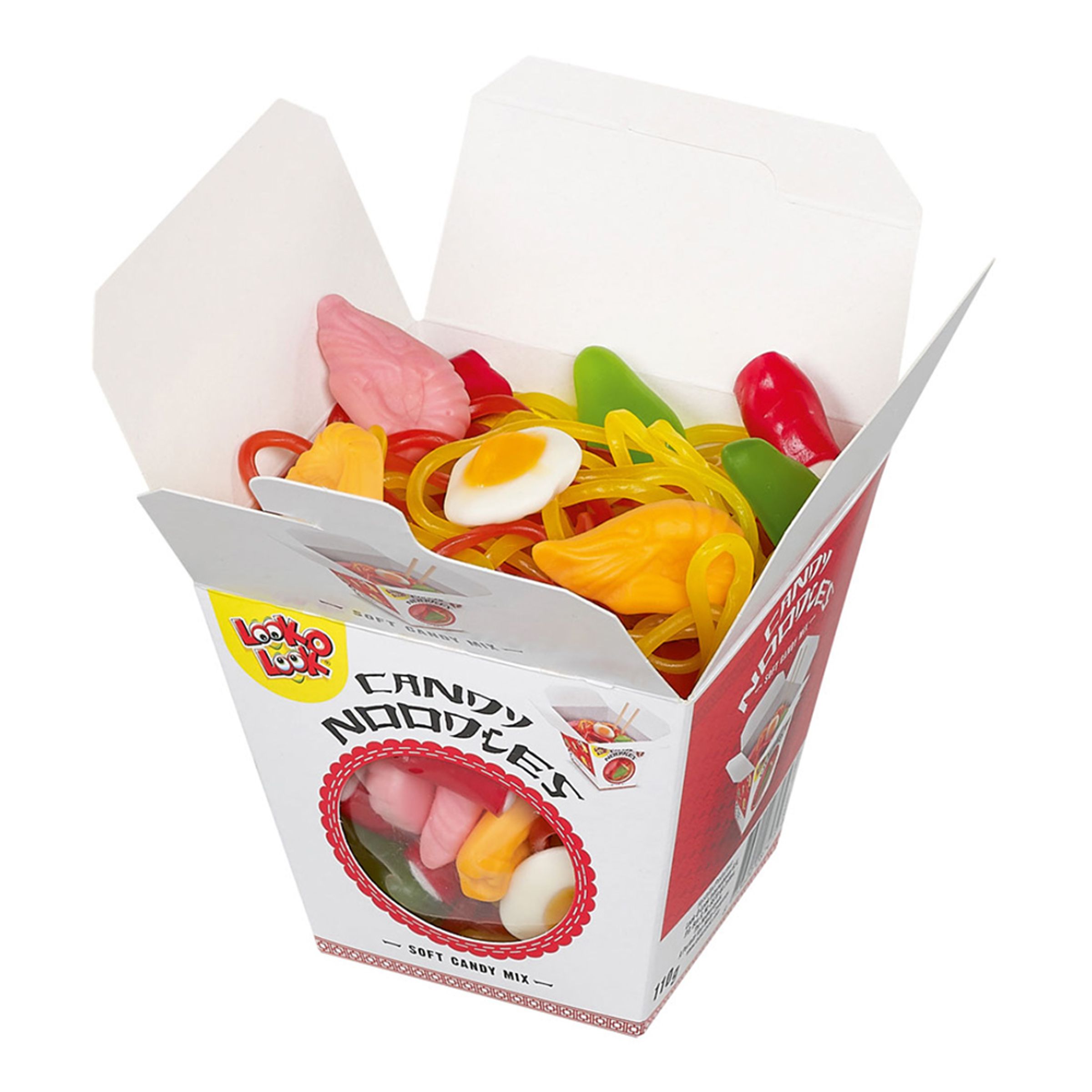 Look-O-Look Godisnudlar innehåller marshmallows och gelégodis med fruktsmaker. Levereras i en liten klassisk kinamatkartong om 110 g.