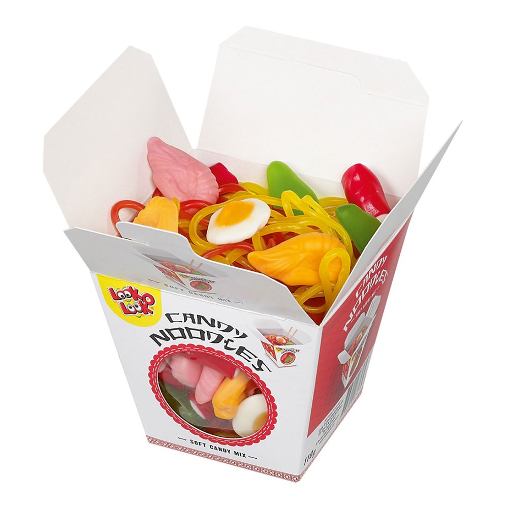 Candy Noodles, en delikatessen från Asien: en färgstark blandning av 23 söta enskilda delar, som ser ut som nudlar, räkor, grönsaker och ägg, men består av fruktgelégodis och marshmallows. Arrangerad som den riktiga asiatiska måltiden i en matchande Asia Snack Box (återvinningsbar kartong). En stor överraskningspresent – inte bara för älskare av köket från Fjärran Östern. Allt som återstår är att säga: Ni Hao och god aptit!