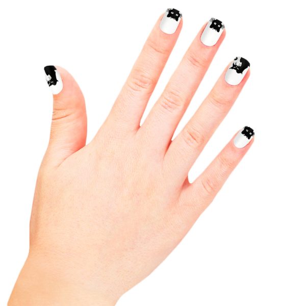 Lösnaglar Halloween Katter Barn omfattar vita lösnaglar för barn med svarta kattmotiv. Naglarna är gjorda av plast och är självhäftande.