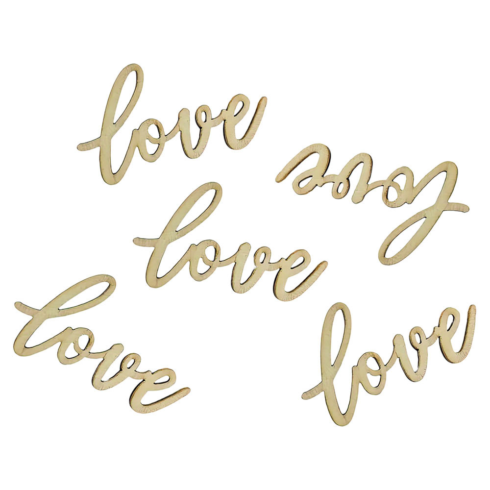 Love Konfetti Trä omfattar 18 stycken konfetti i form av texten "Love". Konfettin är tillverkad av trä och är ca 3 cm höga och 6 cm breda.