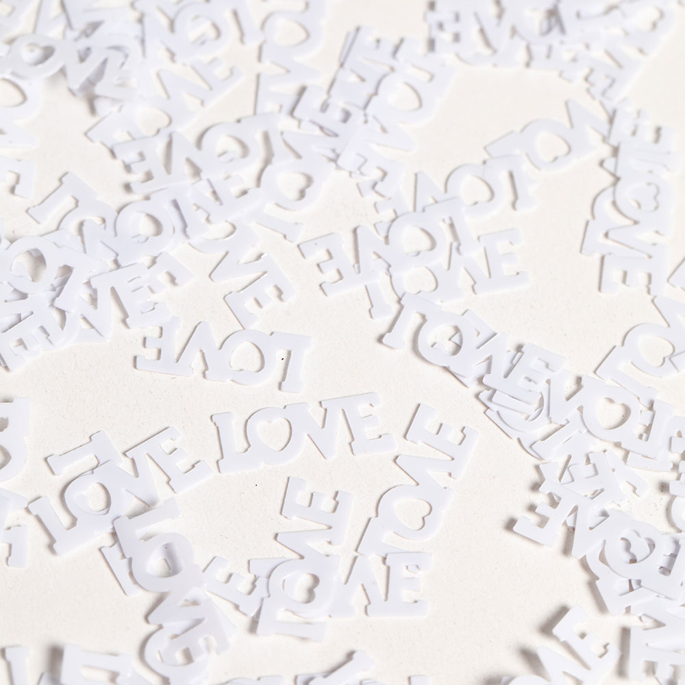Love Konfetti Vit omfattar 14 gram vit konfetti i form av texten "Love".