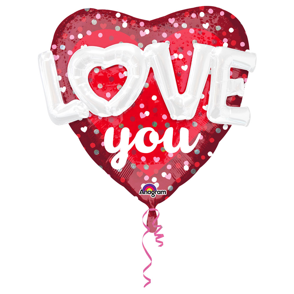 Love You 3D Folieballong omfattar en stor holografisk hjärtballong i rött med motiv av små prickar och hjärtan, texten "You" samt utstickande "Love" text i vitt. Ballongen är tillverkad av folie, fylls med luft eller helium och är ca 91 x 91 cm stor.