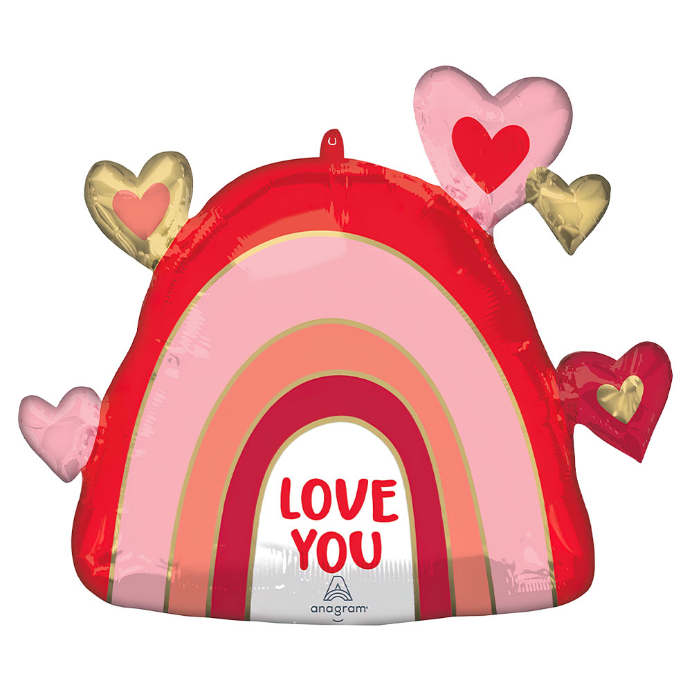 Love You Folieballong Regnbåge omfattar en folieballong i form av en röd, rosa och vit regnbåge med guldiga detaljer, utstickande hjärtan och texten "Love You". Ballongen fylls med luft eller helium och blir ca 58 cm hög samt 66 cm bred.