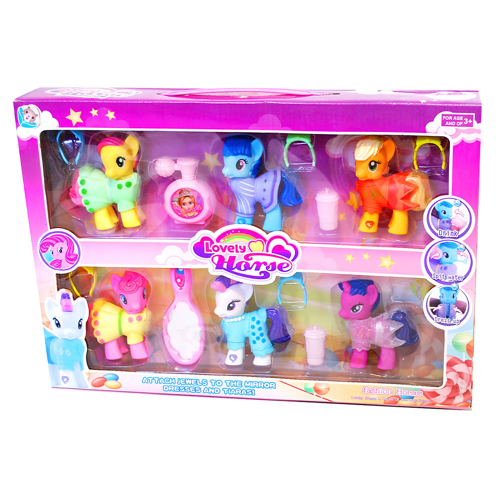 Lovely Horse Enhörningsleksaker omfattar ett set med 6 olika enhörningar och ponnys med söta klänningar. Medföljer även små vattenflaskor, tiaror, en spegel och en låtsas-parfymflaska. Enhörningarna och ponnyerna är ca 7,5 cm höga samt 6 cm långa, och kan även dricka och spruta vatten ur munnen. Leksakerna är tillverkade av plast och passar barn över 3 år.