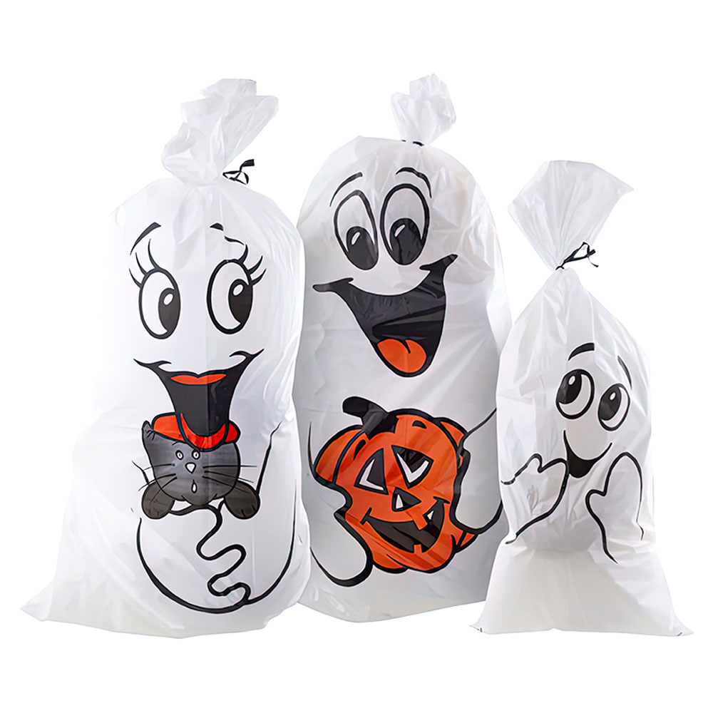 Lövsäckar Spöken omfattar tre stycken vita lövsäckar i olika storlekar. Säckarna är tillverkade av plast och pryds av roliga motiv av spöken. Medföljer även svarta band för enkel förslutning.