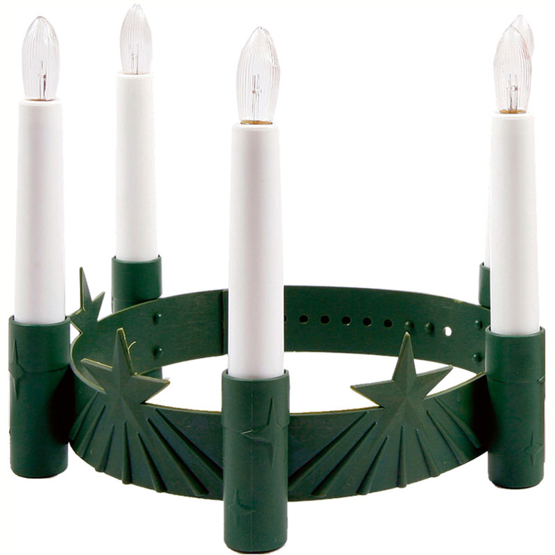 Luciakrona innehåller ett grönt pannband tillverkat i plast med fina stjärndekor och fem lucialjus. Ljusen mäter ca 11 cm i höjden och drivs av 5 x AA-batterier (ingår ej).