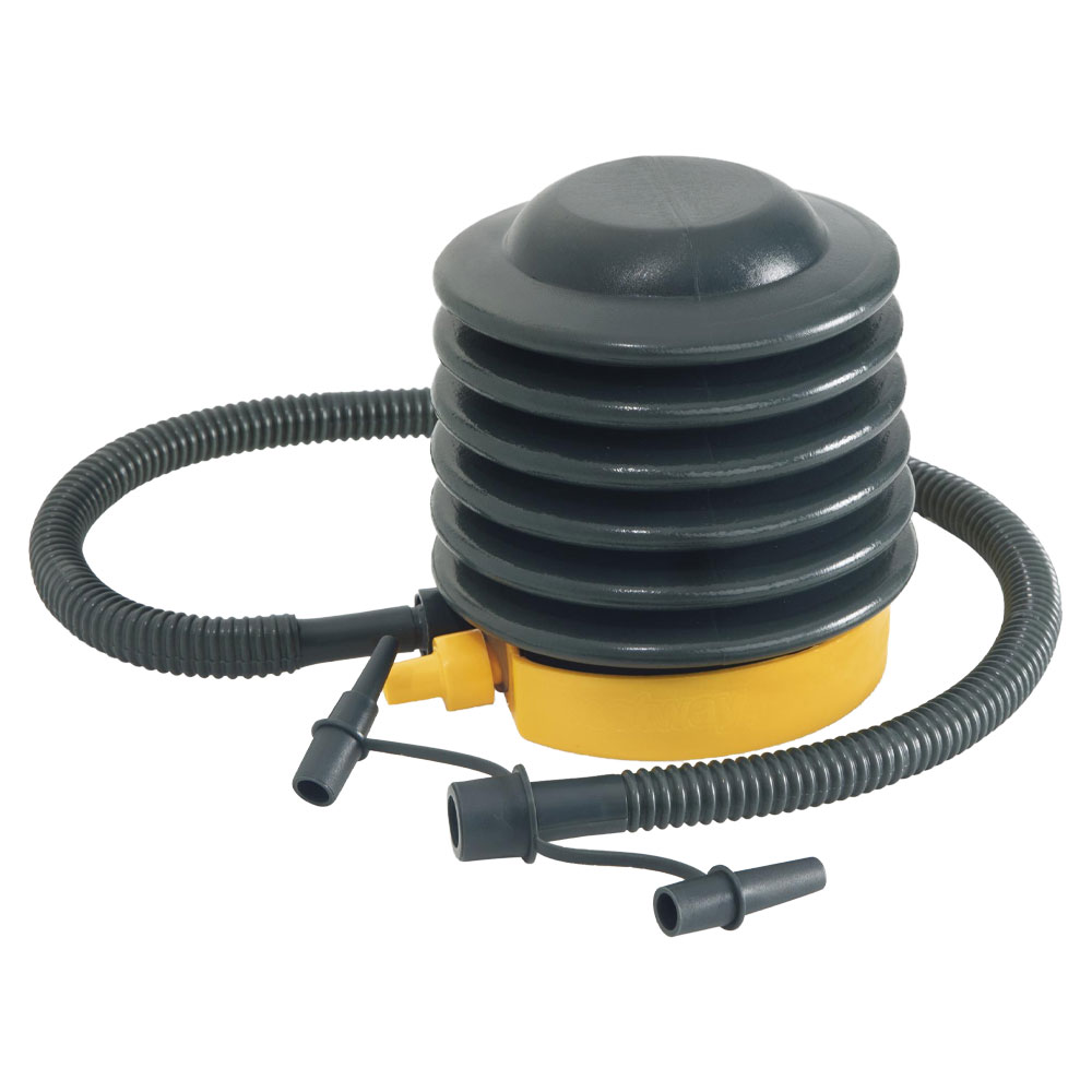 Luftdriven Fotpump Liten omfattar en fotdriven luftpump i mindre variant med slang och tre olika ventiladaptrar som passar till olika uppblåsningsventiler. Fotpumpen byter lätt mellan uppblåsning och tömning och har en pumpvolym på 0.3 liter/cykel. Fotpumpen är ca 13 cm lång och 10,5 cm bred. Tillverkad i gul och svart plast.
