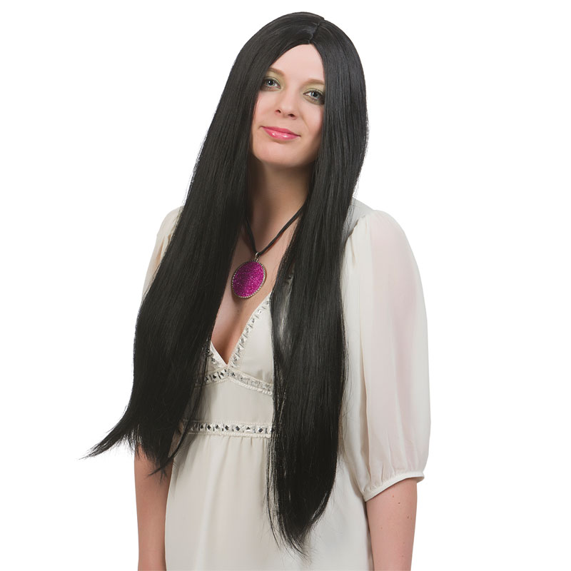 Lång svart peruk med en längd på ca 75 cm.