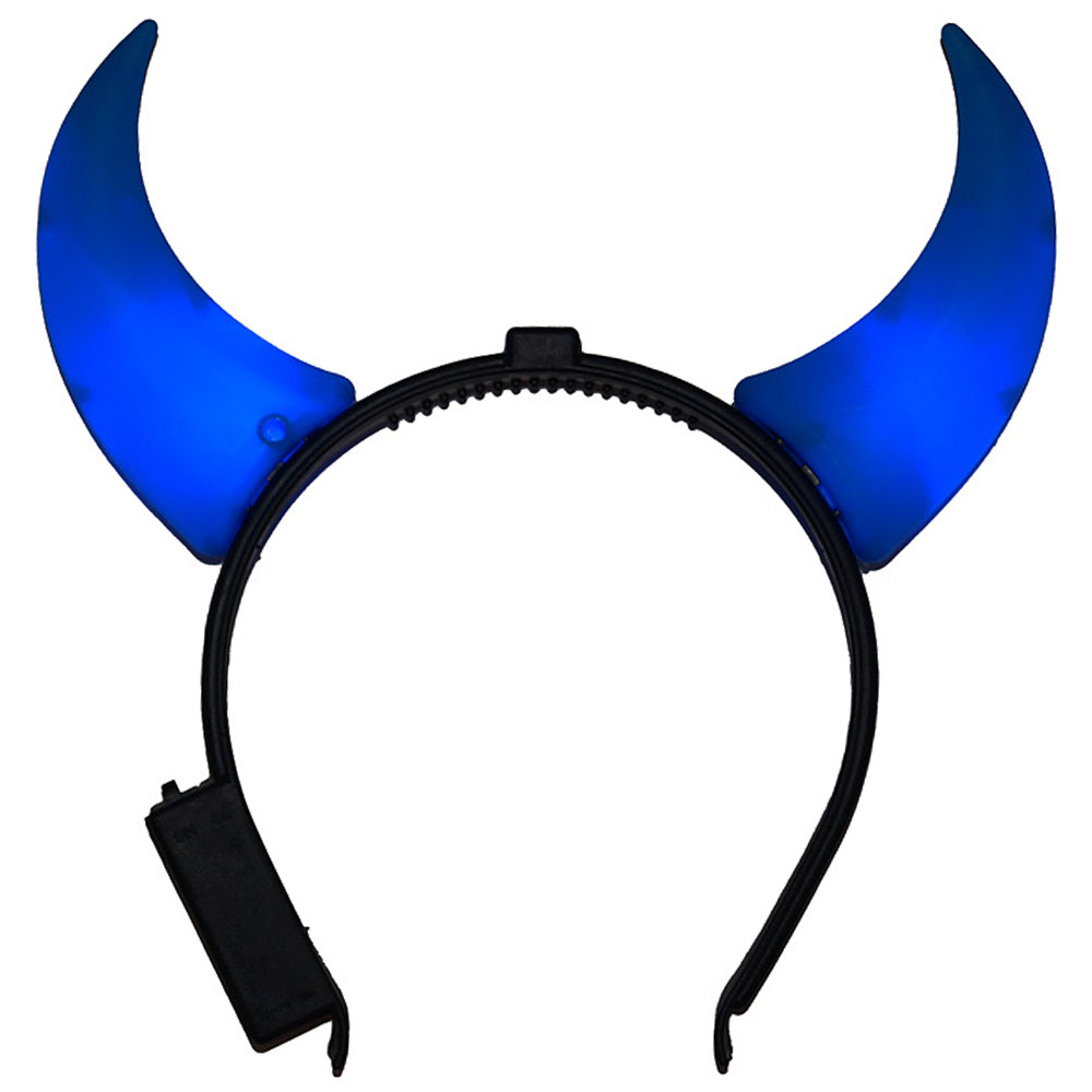 Lysande Djävulshorn Blå omfattar ett svart diadem med LED-belysta djävulshorn i färgen blå.