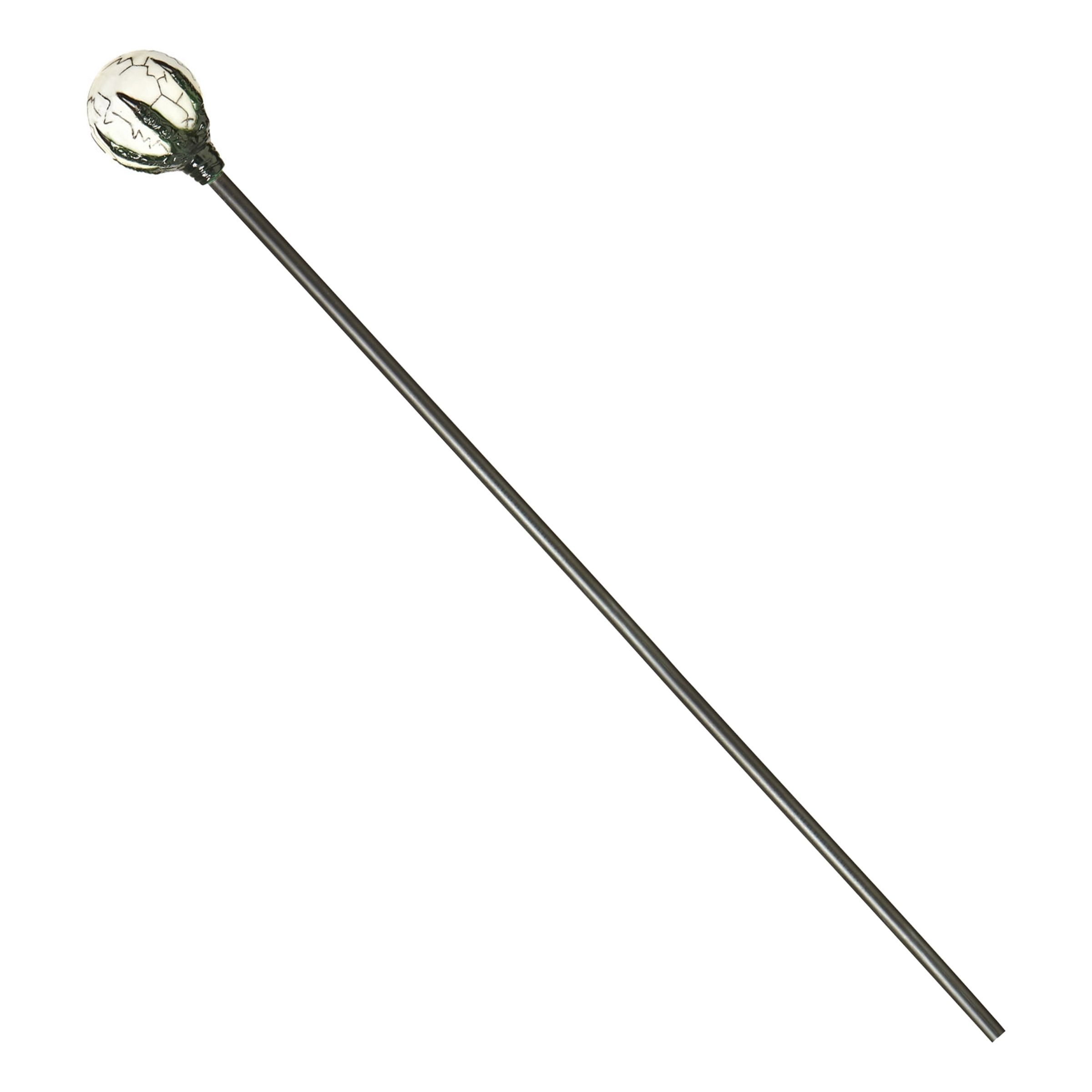 Magisk Käpp med Kula kommer med långt svart skaft med en svart/grön drakhand med långa klor som håller i en vit kula med svarta fejksprickor.