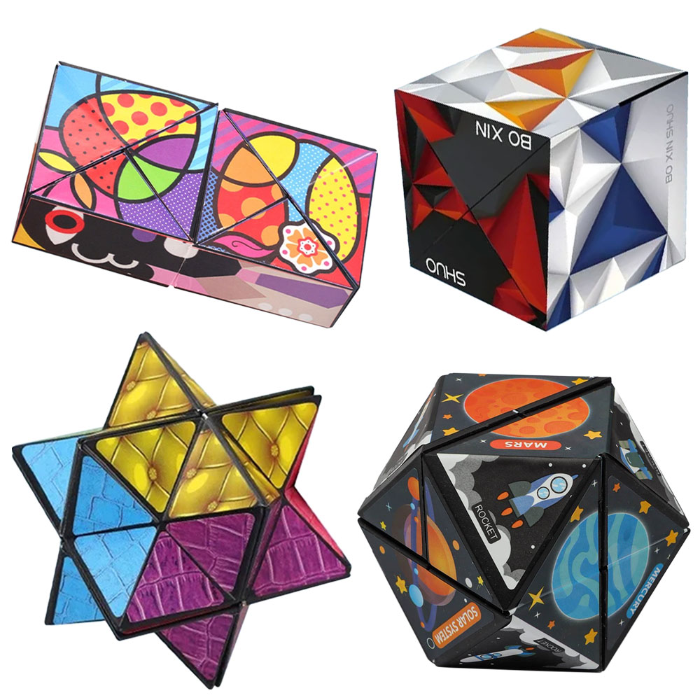 Magisk Kub omfattar en kub som ger möjlighet att skapa flera olika former såsom två kuber eller stjärnor.