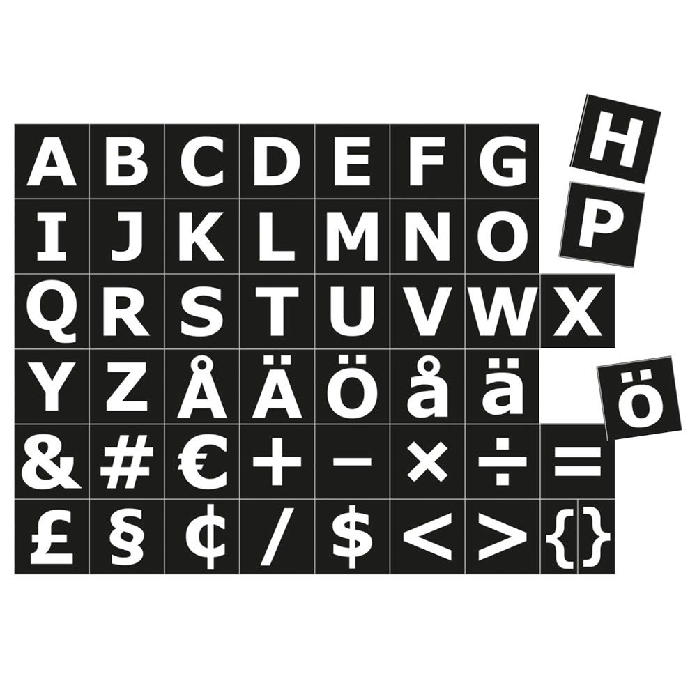 Magnetiska Bokstäver omfattar ett magnetiska ark med sorterade siffror, tecken och bokstäver i svart och vit. Lätta att avlägsna. Idealiska för temporär eller utbytbar markering.
