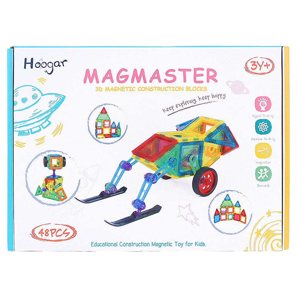 Magnetiska Byggklossar 48-pack omfattar en magnetisk byggsats med magnetiska byggplattor med tillbehör som hjul och andra byggdelar. Dom magnetiska plattorna har runda kanter och ultraljudssvetsning. Denna byggsats innehåller 48 delar som går att byggas till ett hus, en vagn eller något annat spännande. Medföljer gör också en påse för smart förvaring.