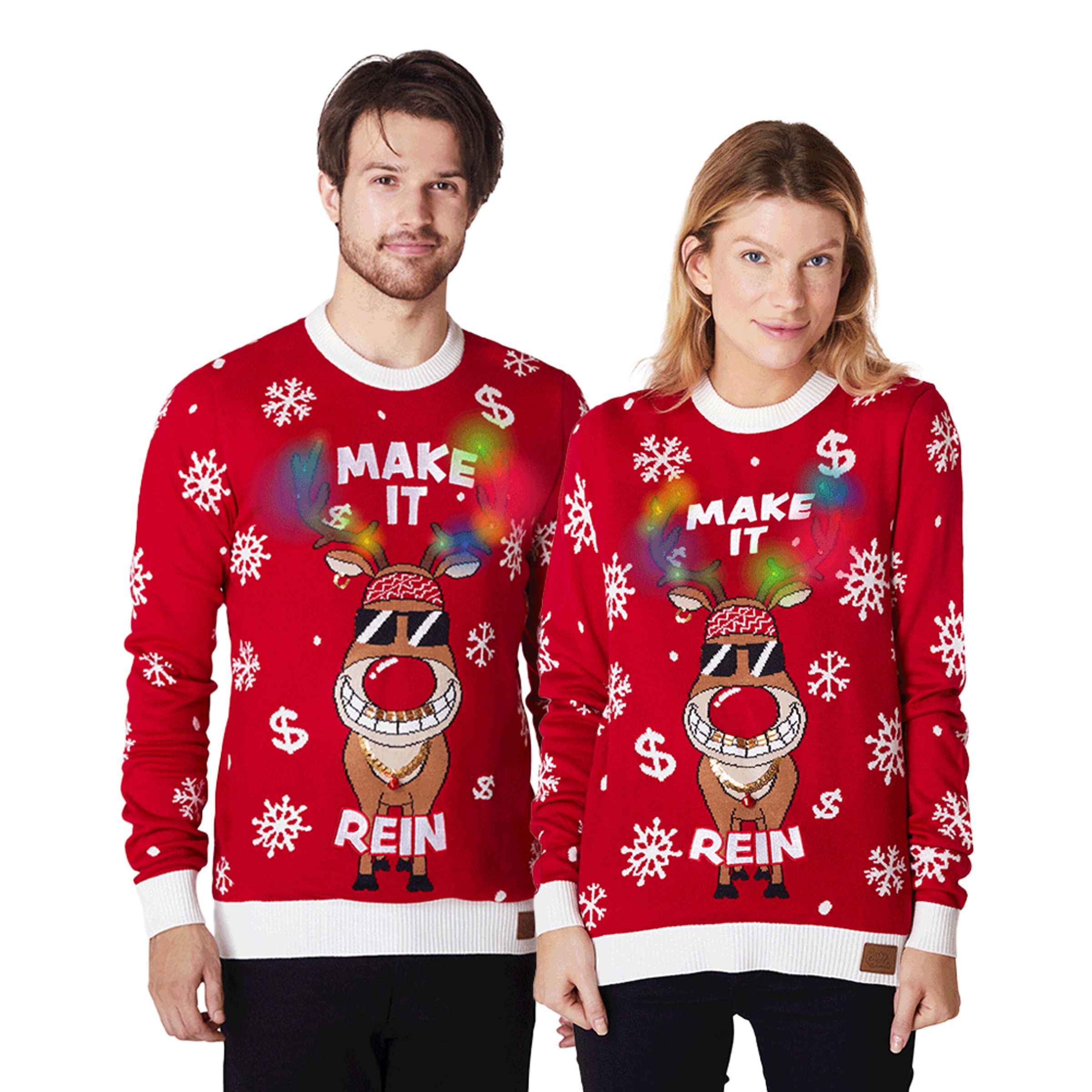 Make It Rein LED Jultröja är en festlig jultröja som kommer med totalt tolv inbyggda LED-dioder. Tröjan kommer i typisk röd julfärg och framsidan kommer med motiv föreställande en ren med glasögon, horn som blinkar i olika färger (vid aktivering), och texten "Make it Rein". Glöm inte att komplettera med batterier (2 x CR2032).