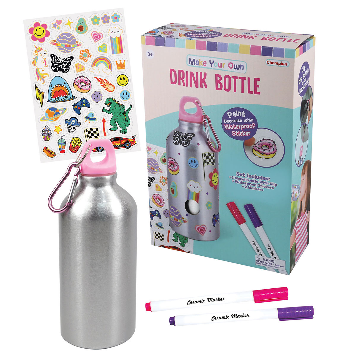 Skapa din egen unika stil med ett set innehållande en praktisk flaska och färgpennor i härliga nyanser. Med hjälp av ett ark fullpackat med klistermärken kan du förvandla aluminiumflaskan till ett personligt konstverk.