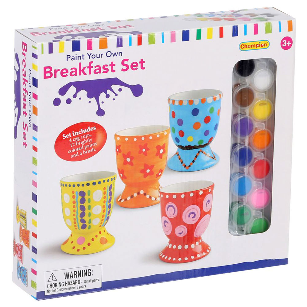 Måla Dina Egna Äggkoppar Pysselset omfattar ett set som består av 4 stycken vita äggkoppar, 6 stycken målarfärger och en målarpensel. Färgerna som ingår är vit, gul, orange, röd, rosa, ljusgrön, mörkgrön, ljusblå, mörkblå, lila, brunt och svart.