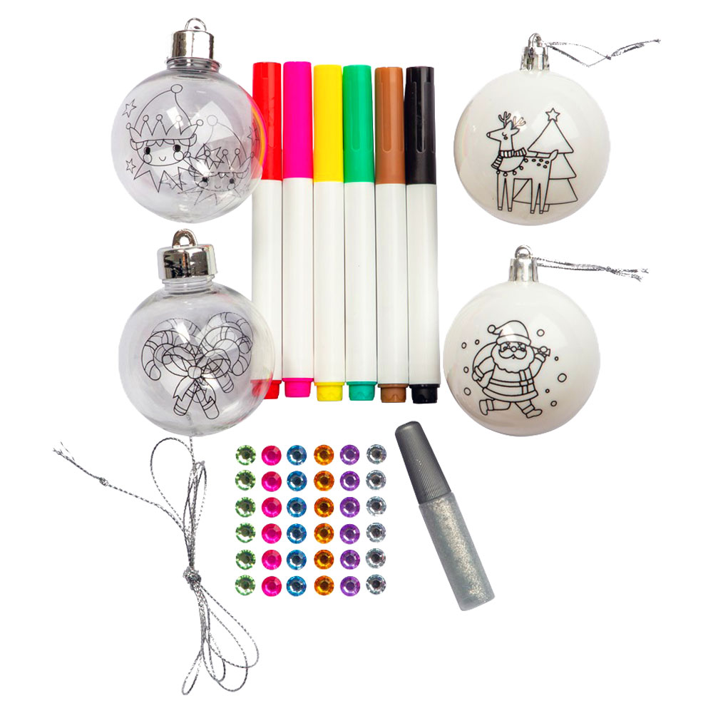 Måla Dina Egna Julkulor Set omfattar ett kit med allt du behöver för att dekorera egna julkulor. Kitet innehåller två genomskinliga och två vita julkulor i plast som du själv får dekorera med medföljande tillbehör i form av färgpennor, klistermärken i form av färgglada diamanter och glitterlim. Julkulorna hängs upp med silversnöre.