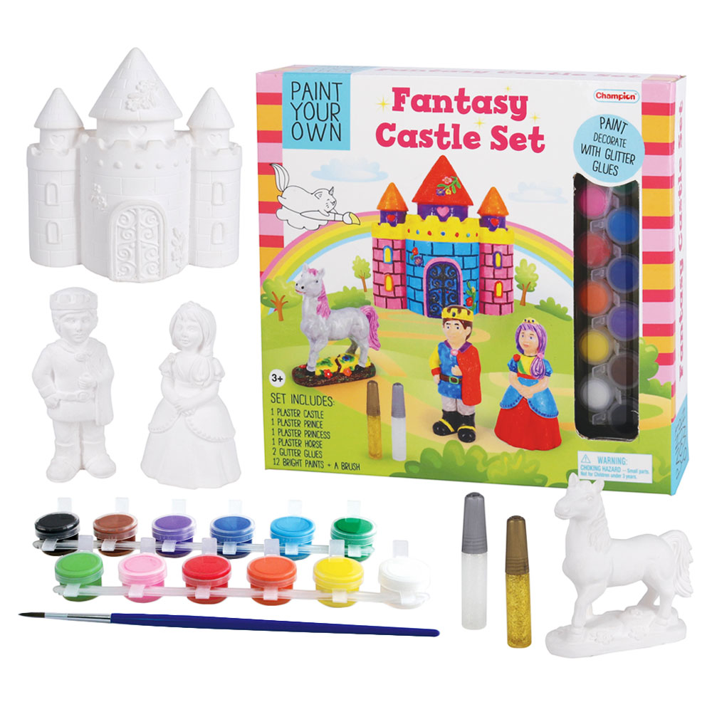 Roligt pyssel set för alla barn som tycker om att måla gipsfigurer! Med detta pyssel kit kan du skapa en sagolik värld med ett slott, en prins, en prinsessa och en häst som du får färglägga med massor av fina färger. Setet kommer med hela 12 olika färger så möjligheterna är oändliga, använd bara din fantasi och måla figurerna riktigt fint!